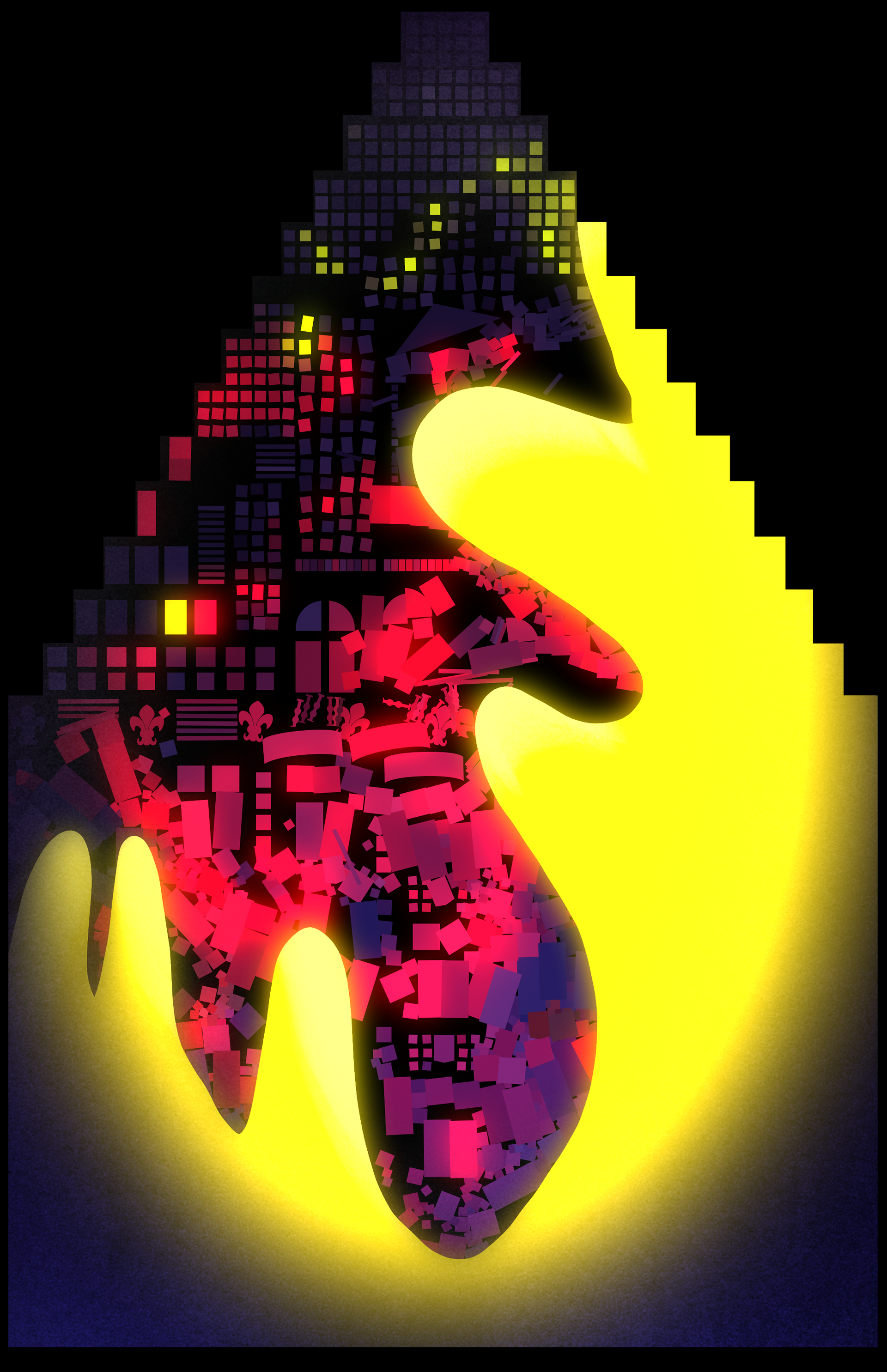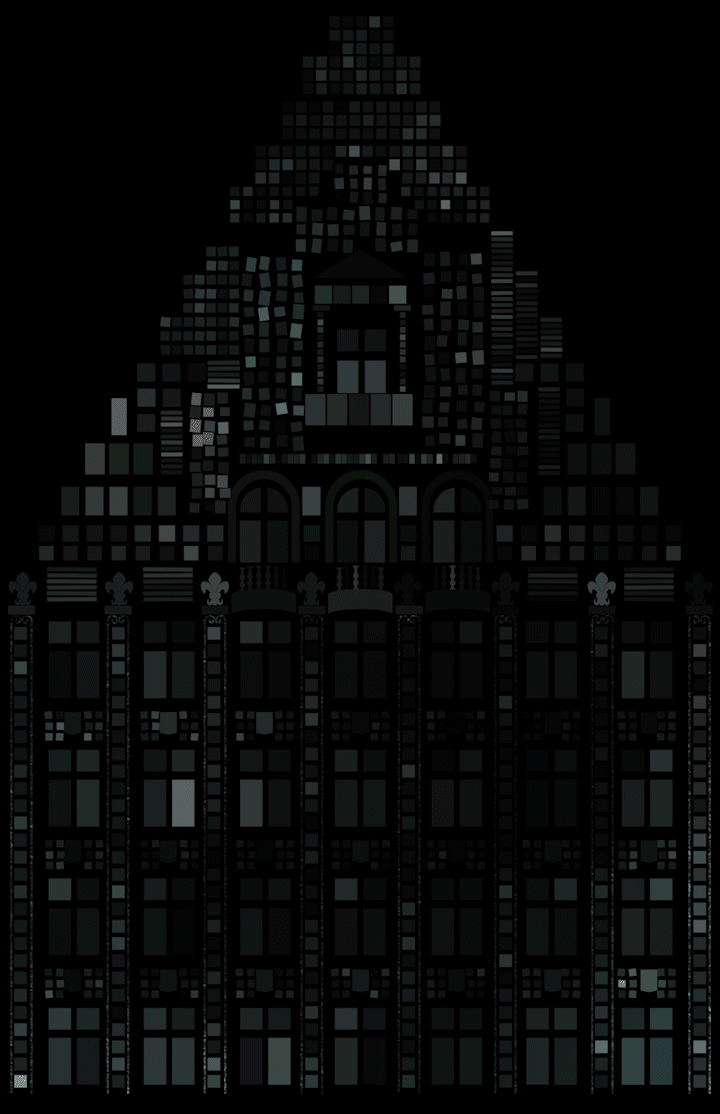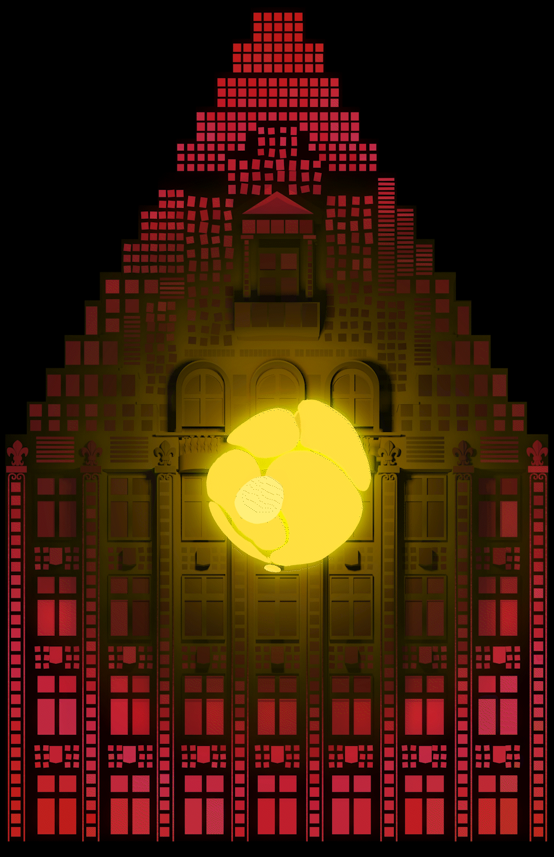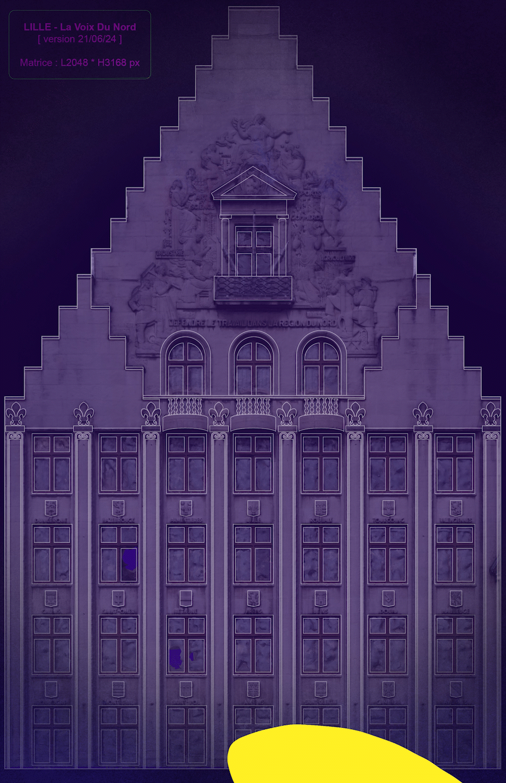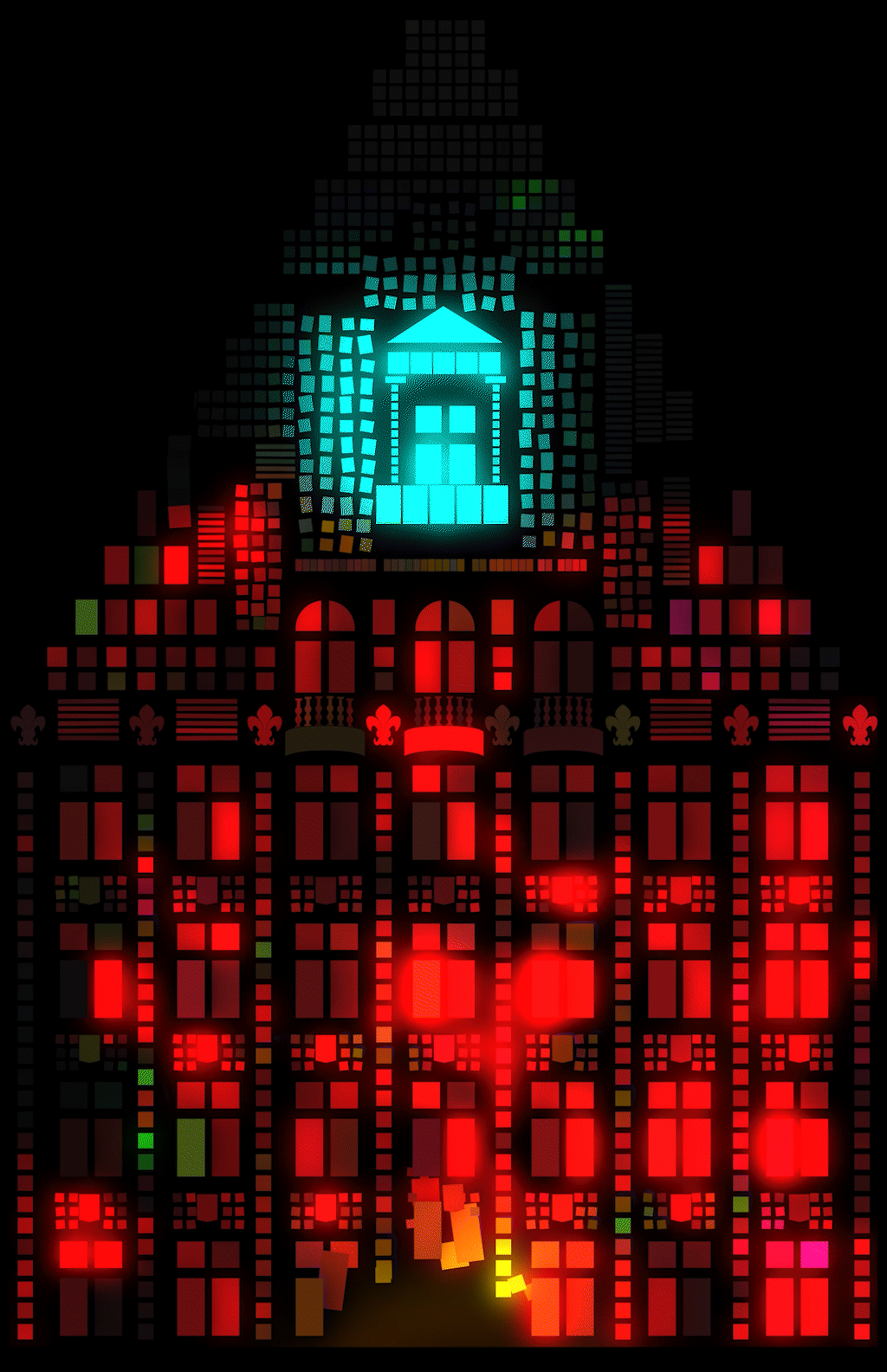 My idea is to create a rough, minimalistic pattern of pixels that corresponds to the front side of the Buildung of “La Voix du Nord”. The pixels seem static and flat, but are resourceful to create strong color arrangements that react to the sound. This pixel-world can be interpreted as the inner soul of the building.